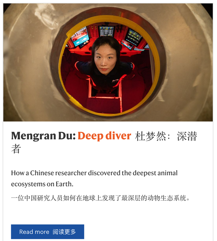 - 入选该榜单的还有一名来自中国的科学家、深海探索者杜梦然,杂志对其评价为「揭开地球最深处动物生态系统的科学家。」榜单强调她在海平面 9000 米以下发现了地球上最深的动物生态系统,在海洋最底层「见证科学界前所未有的景象」。