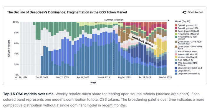 中国开源模型在全球使用量占比从 2024 年初的 1.2%,现在这个数字已经飙升至 30%,全球开源生态的重心已经向中国倾斜。
