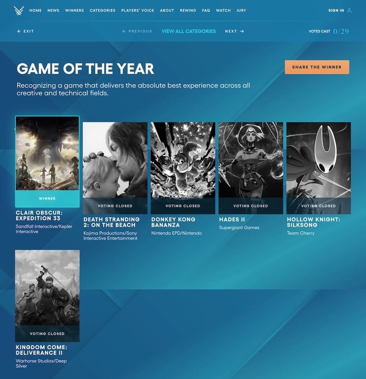 TGA 2025 获奖名单公布,《光与影:33 号远征队》横扫九项大奖