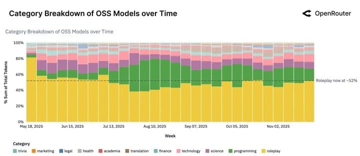 现在,轮到 AI。前几天知名模型聚合平台 OpenRouter,发布百万 Token 使用情况调查报告。报告里毫不遮掩地提到,在开源模型里,所有经由 OpenRouter 处理的 Token(词元,即大模型将文本或图片,转成它能处理的格式),有超过 50% 的流量,都在做「角色扮演」的工作。