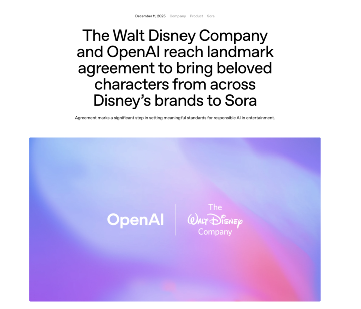 这是一种「风险控制」的思路,跟创作关系不大。迪士尼入股 OpenAI,本质上是在买一张通往未来的船票。技术只会越来越好,打不过就加入,然后用它来降低自己的生产成本。