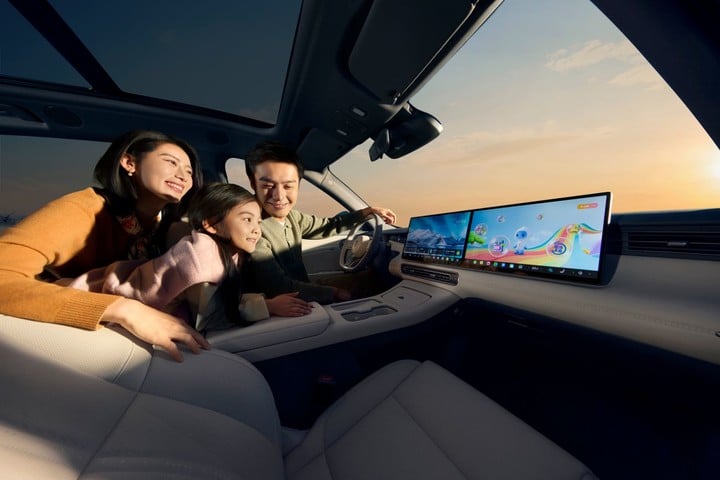 整个座舱前排的视觉核心是一块双 15.6 英寸 2.5K 分辨率超薄联屏,整体屏占比达 88.5% 。驾驶位前方则配备了同级领先的 30 英寸 AR-HUD,亮度高达 12000 尼特,支持强光下清晰显示及眼球追踪自动调节 。