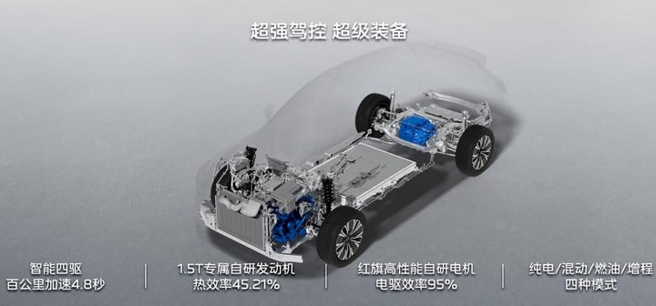 动力层面,红旗 HS6 PHEV 基于红旗自研「鸿鹄」插电混动平台打造,全系搭载 1.5T 混动专用发动机,热效率 45.21%,最大功率 110kW,匹配前/后电机组成两驱或四驱版本。