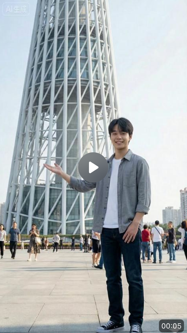 全运会刚结束,如果你也在广州,一定忘不了「活力大湾区,魅力新广州」这句魔性的口号。我们生成了一张站在广州塔前面的照片,然后在豆包「照片动起来」里面输入提示词。