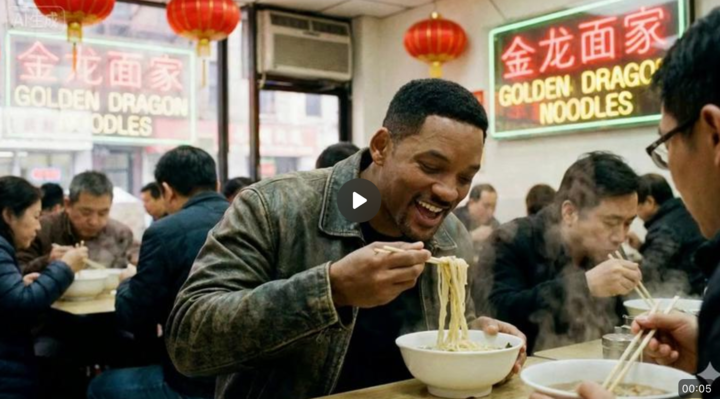 即便是在中餐厅面馆里吃面的威尔·史密斯,Seedance 1.5 Pro 还是让他自动用英文来说话,而且这个吃面姿势也完全对了。