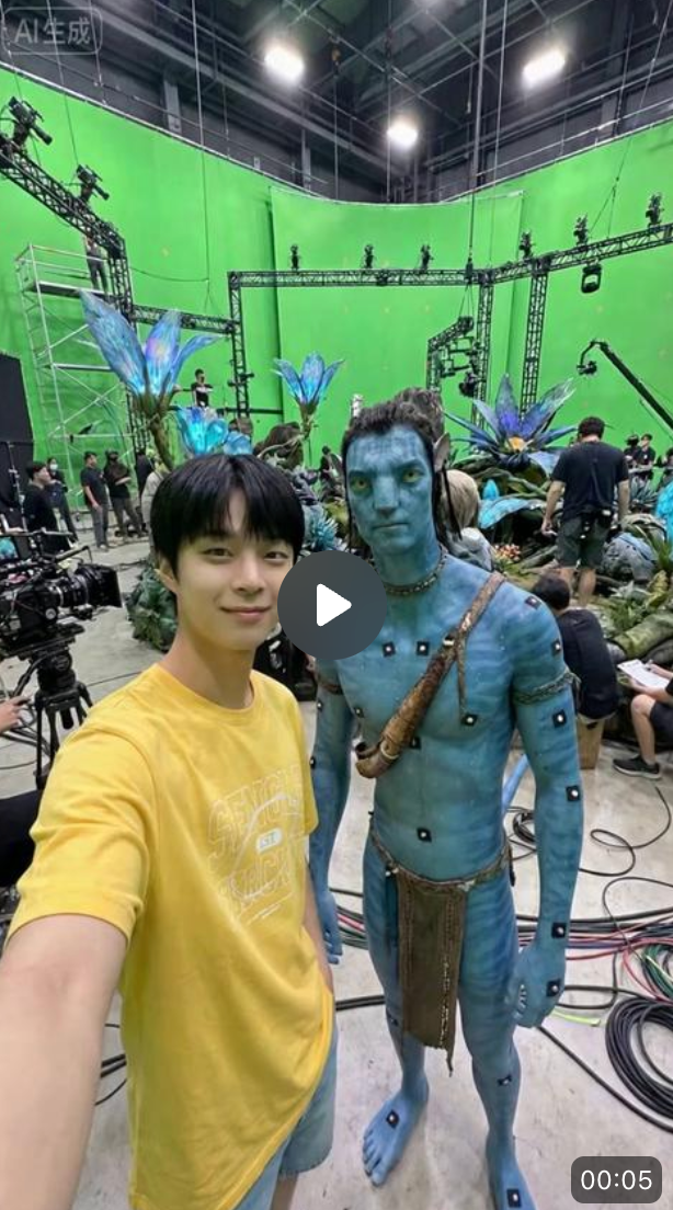 同样地,我们用它复刻了 AI 片场探班的视频,直接上传一张图片给豆包,不输入任何提示词,它会自动用中文来生成视频,还配上了台词,「哇,跟阿凡达合影啦!」