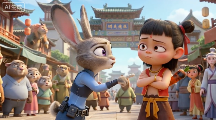 ▲提示词:[0s-4s] 朱迪指着哪吒说(普通话,语速快,严肃): “那个小孩!站住!双手抱头!根据《动物城交通法》,你刚才风火轮超速了!” • [5s-10s] 哪吒(四川话,翻白眼,语速慢,拖长音): “哎呀,莫挨老子!我是踩的风火轮,又没烧你的油。瓜娃子,管得宽!”