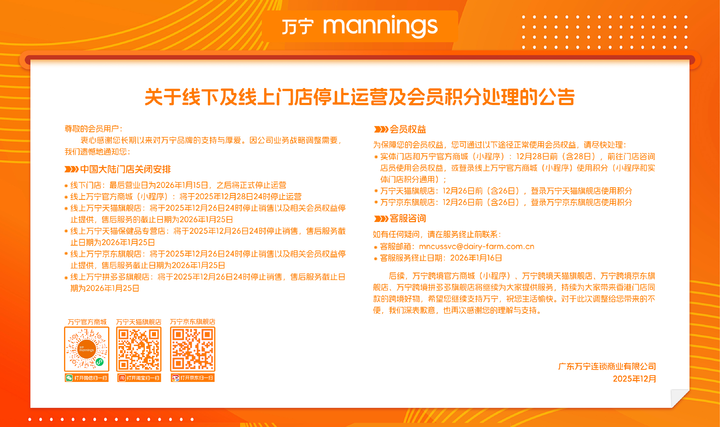 - 线上门店:最后营业日为 2026 年 1 月 15 日,之后将正式停止运营;