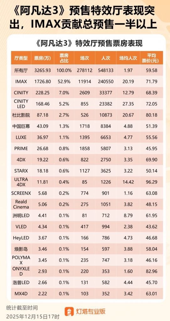 根据灯塔研究院在 12 月 15 日公布的数据,《阿凡达 3》预售票房 3265.93 万元,其中 IMAX 影厅票房占比 52.9%,CINITY LED 和杜比影院也将近 10%,特效厅表现突出。