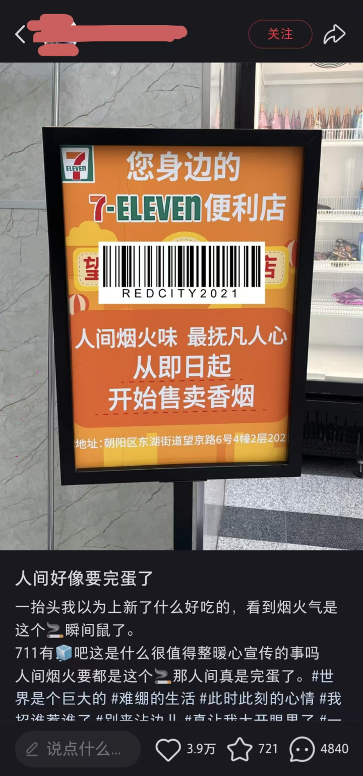 据悉,日前有网友发文称,北京市某家 7-ELEVEN 便利店,悬挂了「人间烟火味最抚凡人心」的香烟广告。