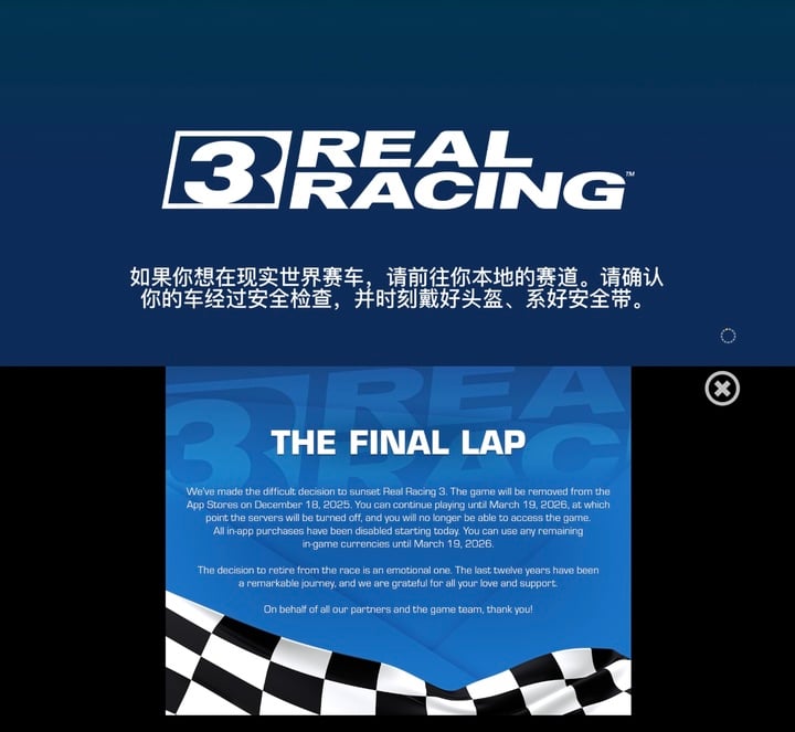 日前,EA 旗下移动平台赛车类游戏《真实赛车 3》(REAL RACING 3)宣布,已在近日(12 月 18 日)正式从 App Store、Google Play 下架游戏,并且关闭游戏内购。