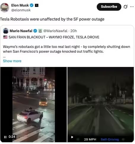 旧金山停电致 Waymo 瘫痪,马斯克贴脸补刀:我们不受影响
