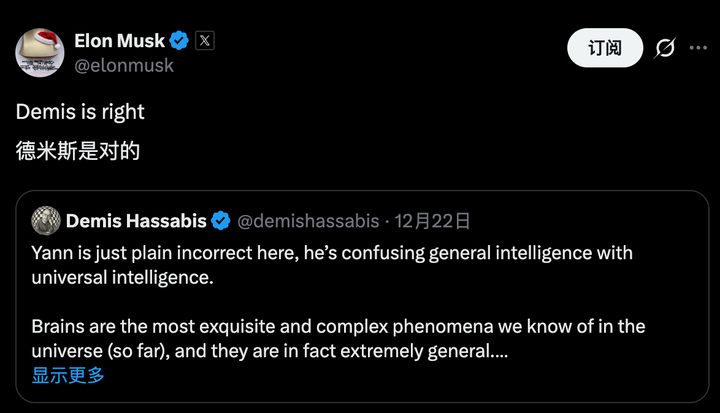 有趣的是,马斯克转发了 Hassabis 的消息,并表示「他是对的」。而马斯克的评论区也被网友吐槽「他的键盘没有『错误』这一说法」。