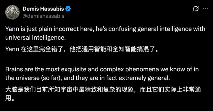 而 Hassabis 转发了 LeCun 上述内容,并强调「LeCun 完全错了,他把 AGI 和全知智能搞混了」。Hassabis 表示,大脑是人类目前所知宇宙中最精致和复杂的现象,而且它们实际上非常通用。