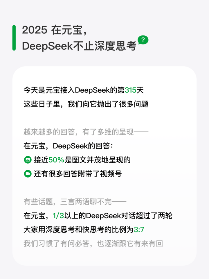据悉,截止 2025 年 12 月 24 日,元宝已接入 DeepSeek 315 天。在元宝中,1/3 以上的 DeepSeek 对话超过两轮,用户使用深度思考和快思考比例为 3:7。