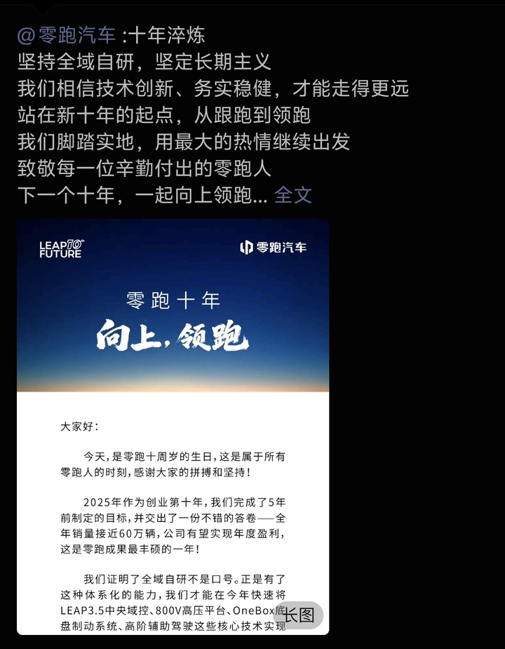 昨日,零跑汽车迎来创立 10 周年,零跑汽车创始人、董事长、CEO 朱江明发布《致全体零跑人的一封信》。