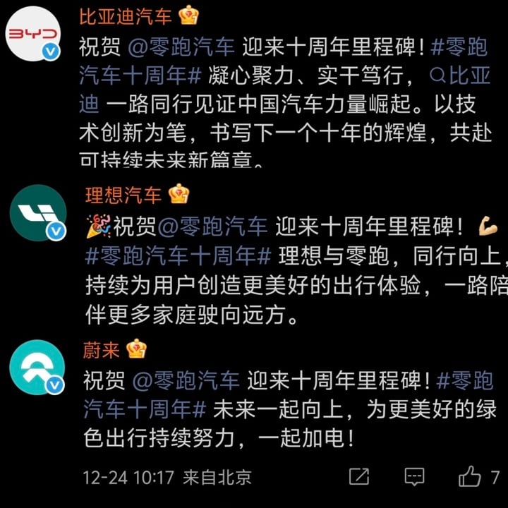 随后,多家车企纷纷在评论区祝贺零跑汽车: