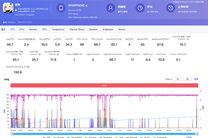 拿最典型的《原神》和《崩铁》为例,《原神》自动亮度 Wi-Fi 最高画质 60 帧 15 分钟挪德卡莱跑图 + 15 分钟魔女棋局副本,Perfdog 记录的平均帧率为 58.7,机身最高温度约 40.2 度: