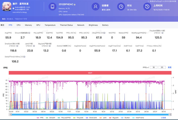 相同环境的《崩坏:星穹铁道》15 分钟日间奥赫玛跑图 + 15 分钟铁幕副本后,小米 17 Ultra 平均帧率稳定在 55.9 帧,机身温度则来到了约 49.3 度: