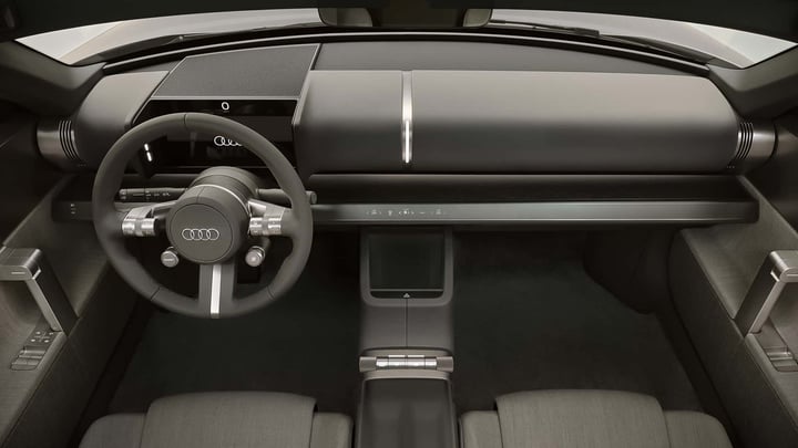 座舱内部的设计逻辑同样也有反转。在如今车载大屏甚至已经卷到副驾驶位的环境下,奥迪在这台跑车上非常克制。量产版车型预计会采用一套非常简洁的交互方案,中控区域的核心是一块可以完全收起的 10.4 英寸屏幕,必要时,可以将视觉空间还给驾驶员和前方的路面。