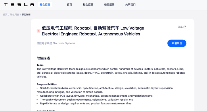 从公布的招聘启事显示,该职位为特斯拉 Robotaxi 自动驾驶汽车的低压电器工程师,所属部门为低压电子系统,工作地所在城市为上海。