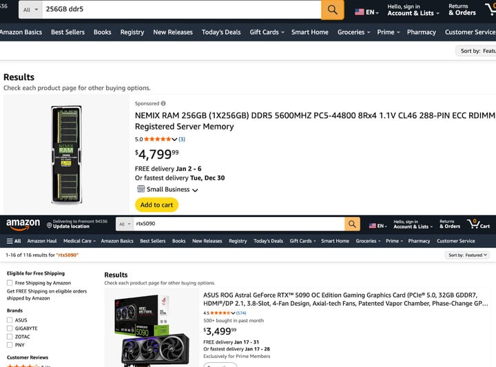 另外,据亚马逊美区显示,目前一根 NEMIX 的 256GB DDR5 内存条售价(4799.99 美元,约合人民币 3.36 万元)已经超过一张 RTX 5090 的售价(普遍在 3499.99 美元左右,约合人民币 2.45 万元)。