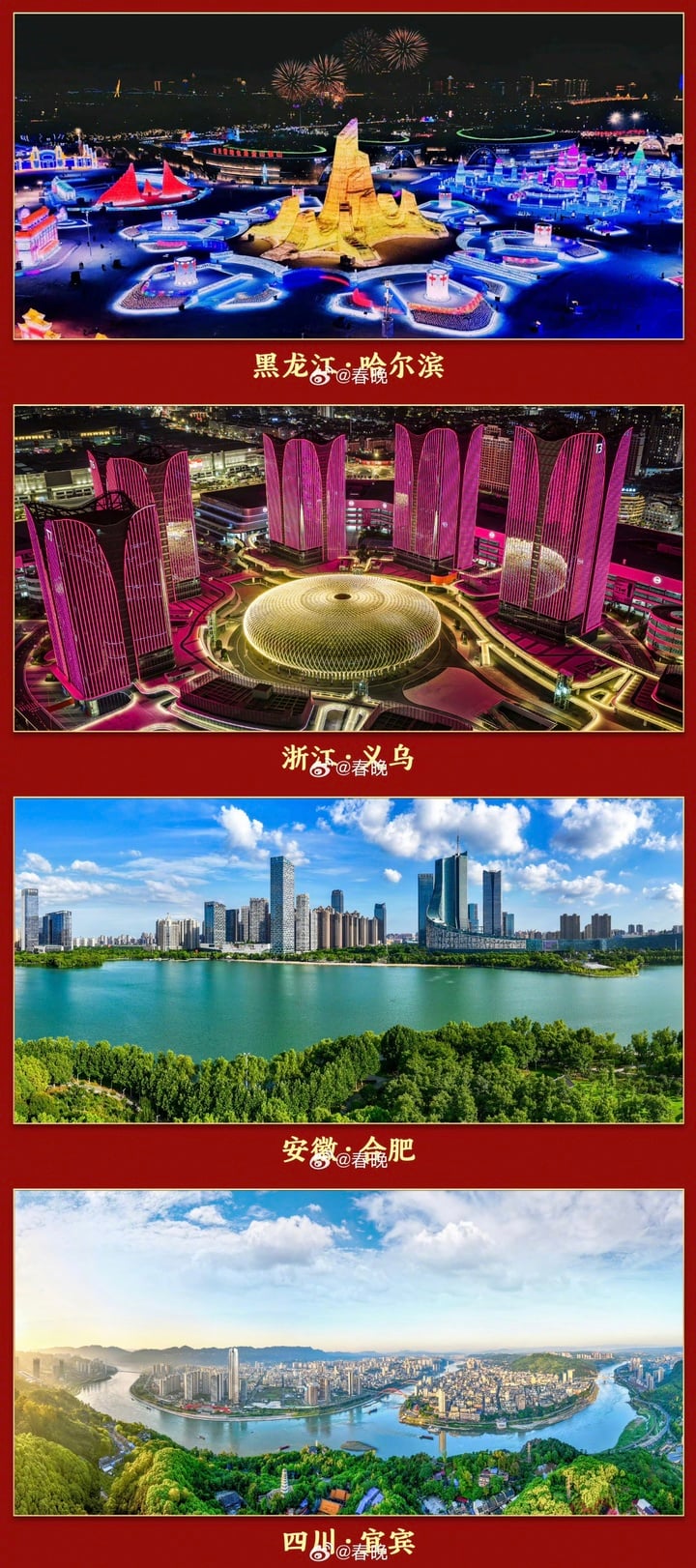 官方介绍,黑龙江哈尔滨、浙江义乌、安徽合肥、四川宜宾将与北京主会场一起,打造彰显文化底蕴、洋溢民俗风情的新春舞台,为春晚这一文化年夜饭注入各具特色的时代气息和别样魅力。