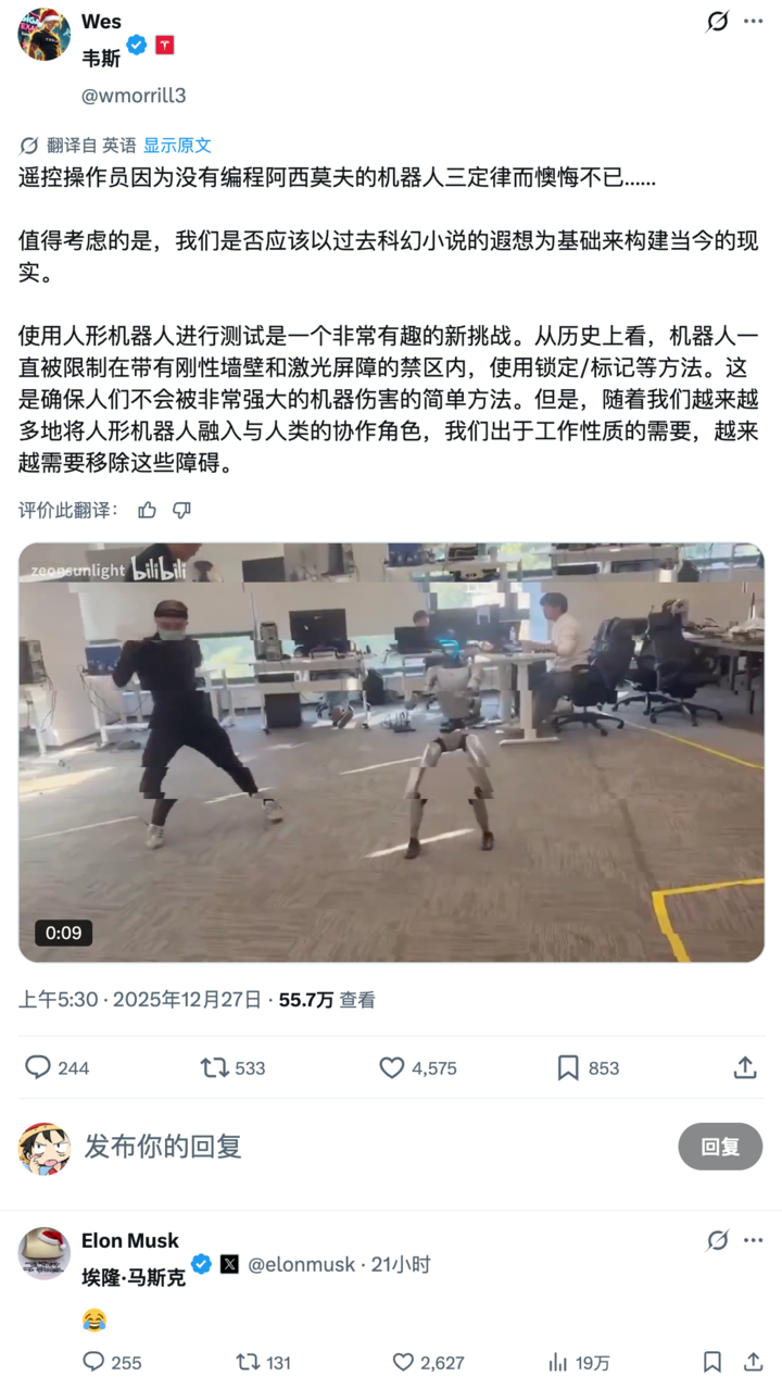 马斯克本人也看到了这个视频,在评论区发了一个「😂笑哭」表情包作为回应。这也是他继上次评价宇树 G1 在王力宏演唱会上的表现后,近期内第二次对宇树机器人发表看法。
