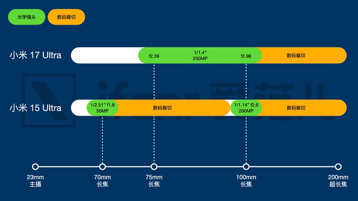 换句话说,相比小米 15 Ultra 在拍摄 75mm 时只能在一块 1/2.51″ 的 5000 万像素传感器上裁切,小米 17 Ultra 可以直接用满一块 1/1.4″ 的 2 亿像素传感器——