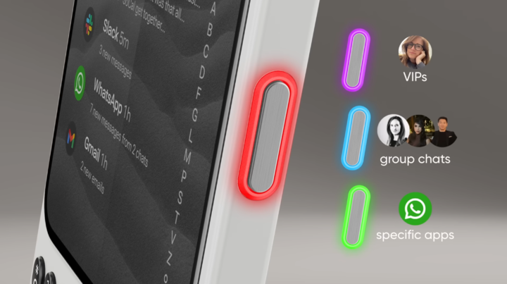 比如 Communicator 机身右侧有一枚「闪念胶囊」键,用户可以自行设置成录音、语言输入或者转写等等功能。这颗按键周围设置了 LED 通知灯,可以根据不同类型的通知发光提示: