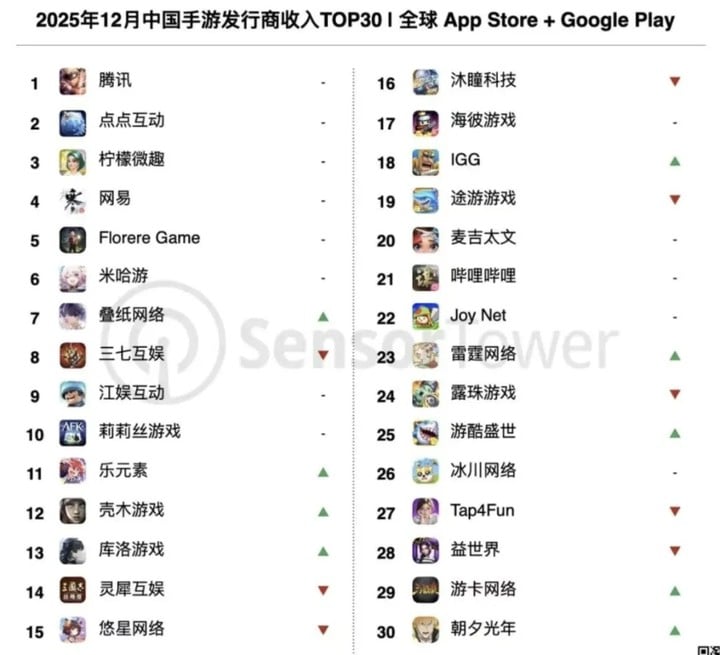 腾讯凭借多款产品的稳定表现,蝉联去年 12 月全球手游发行商收入冠军。