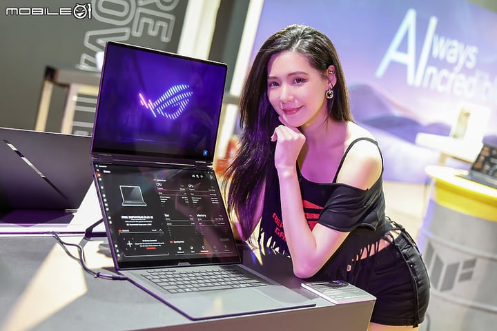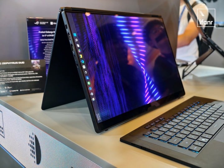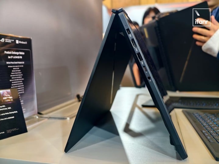 得益于这个角度极大的铰链,ROG 幻 16 双屏可以「超级变换形态」,现场的工作人员直接给我们展示了几种玩法。