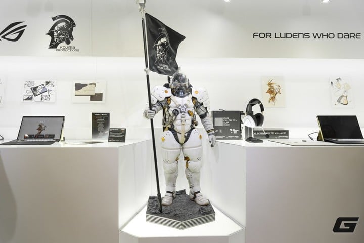 现场还搭建了 ROG 与小岛工作室的联动展台,一具硕大的 Ludens 雕像矗立其间,而展台的主角,则是华硕与小岛工作室联名合作推出的 ROG Flow Z13-KJP。
