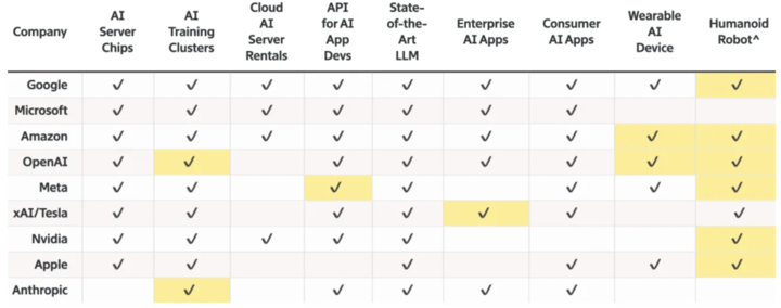 包括 OpenAI、Meta、xAI、谷歌、微软等科技巨头一边在模型、芯片、服务器和终端设备上加速补齐技术栈,另一边也在机器人和可穿戴设备等新赛道提前卡位。