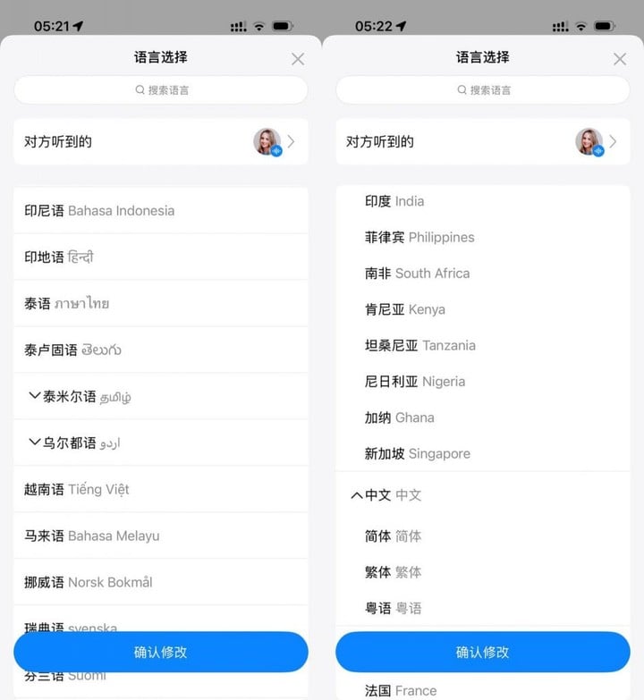 把耳机分成两半,手机上选好语种,双方佩戴后各说各的语言,耳机即可实时播放对应译文,延迟很小,只有两三秒。