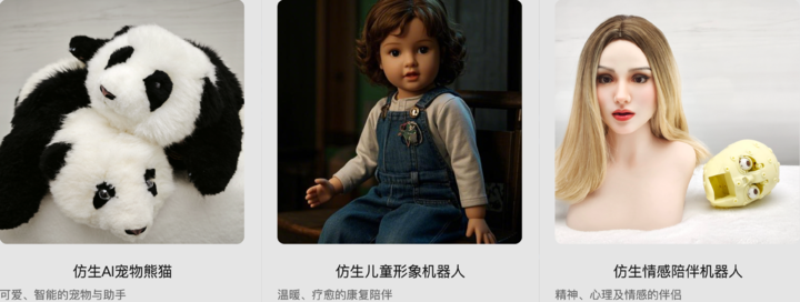 除了 AI 熊猫,他们还开发了多款仿生机器人,主要都是提供情感支持和陪伴类服务。