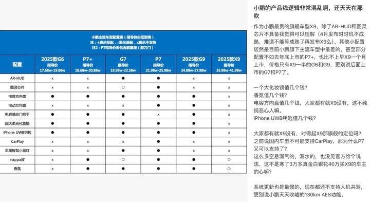 再比如产品定义上犯的错,在性价比和技术迭代的双重压力下,小鹏曾出现过功能配置的 「断层」。比如,为了推新车的卖点,某个新功能在旗舰车型上缺席,却在更低价位的车型上首发;或者新版本的 OTA 让旧车型的功能体验反而下降。