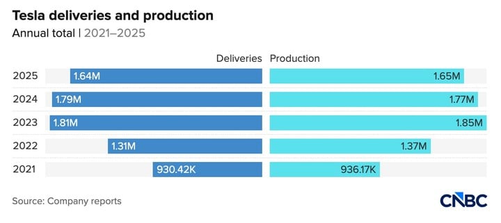 ▲特斯拉近几年的交付数据,左侧为交付量,右侧为生产量 制图:CNBC