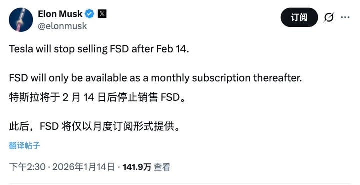 特斯拉 FSD 买断制将成历史,2 月 14 日起全面转为订阅