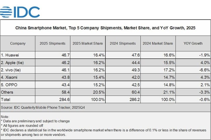 IDC:去年 Q4 全球手机出货量增长 2.3%,华为重回中国市场第一