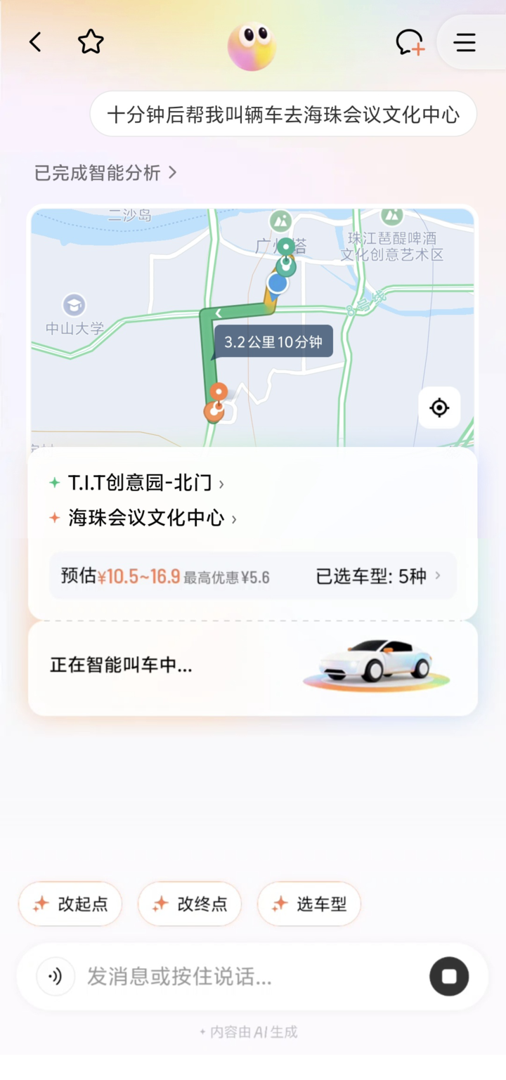在这里,我的指令是「十分钟后帮我叫辆车去海珠会议文化中心」。这句话可以理解成「十分钟再开始叫车」,也可以理解成「十分钟后出发」。