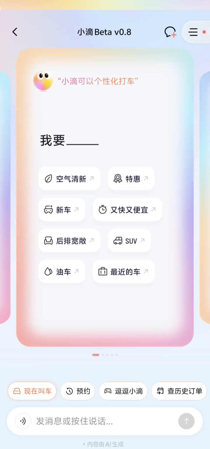 打开 AI 叫车的界面,就能看到,小滴已经给出了常见的筛选标签,「空气清新」「SUV」,只需要点击对应的标签,就可以直接形成叫车指令。