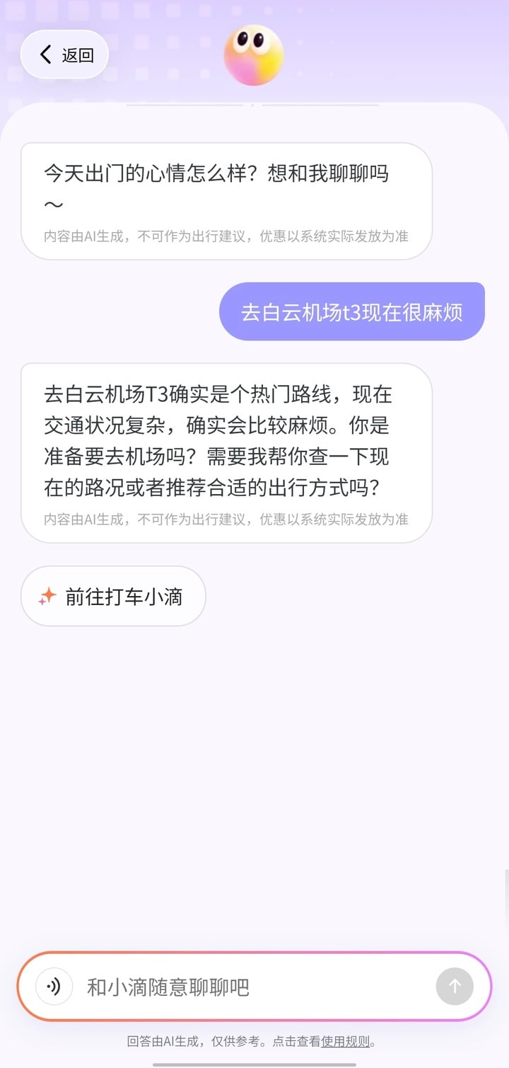更有趣的是,小滴还在尝试扮演出行路上「情绪搭子」的角色。