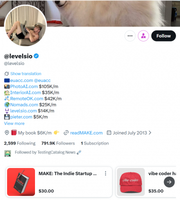 他自学成才,独立开发,从 2012 年到 2021 年,启动了 70 个创业项目,成功运营 40 个,最成功的是 Nomad List,一年盈利 210 万美金。2021 年后,做了几个 AI 产品,包括月入 13.8 万美元的 Photo AI 和月入 3.8 万美元的 Interior AI。