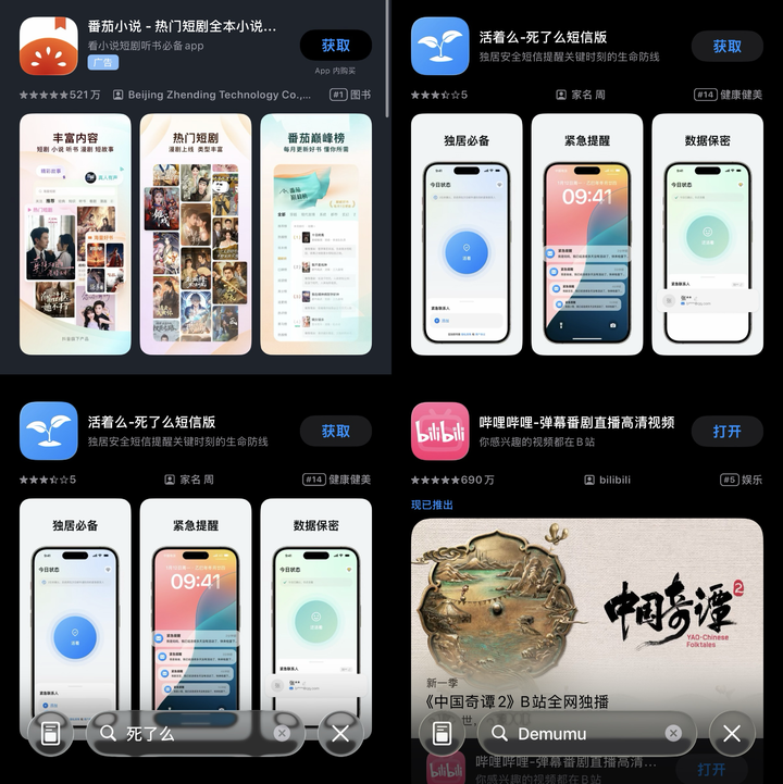 昨晚,「死了么」App 突发下架,在苹果 App Store 与安卓应用商店均已无法搜索下载,搜索结果中出现了多款名称相近的产品,包括「活着么 – 死了么短信版」「Dead Yet? Pro」「死了么漂流版」等。