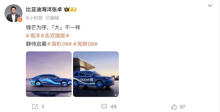 1 月 16 日上午,比亚迪释放出了海洋网旗下的「8 系双旗舰」车型 —— 轿车海豹 08 与 SUV 海狮 08 两款新车的预告图。