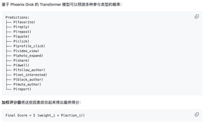 这是一个基于 Grok-1 修改版的大模型,它不依赖预设标签,而是通过「注意力机制」直接预测用户对某条帖子做出特定动作的概率,既包括点赞、回复、点击等正面行为,也涵盖拉黑、不感兴趣等负面反馈。