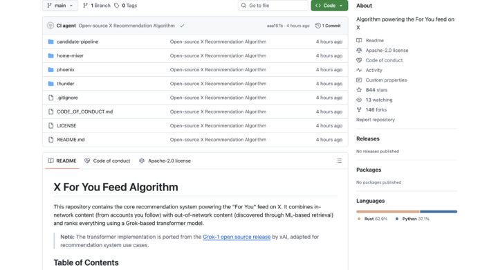 目前的开源版本包含核心推荐逻辑、Rust 编写的候选处理管道以及详细的架构文档。