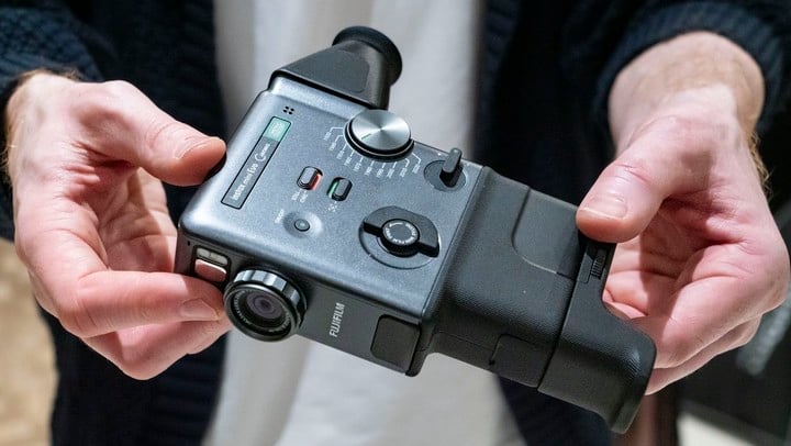 而 2026 年初登场的 Evo Cinema,几乎是从 Single-8 的模子里刻出来的——标志性的垂直手柄、位于食指指肚下的扳机式快门,打印照片的拨钮,甚至还配备了额外安装的光学取景器配件,富士做复古,确实是从不让人失望。