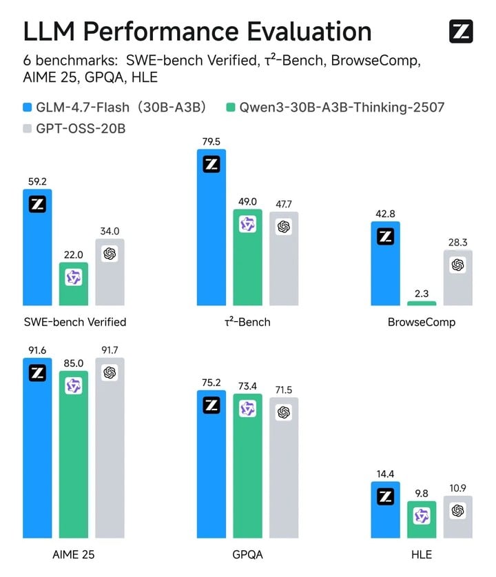 在性能方面,多家报道均提到 GLM‑4.7‑Flash 在 SWE‑bench Verified、τ²‑Bench 等主流基准测试中取得开源同级别 SOTA 成绩,综合表现超过 gpt‑oss‑20b、Qwen3‑30B‑A3B‑Thinking‑2507 等同尺寸模型。